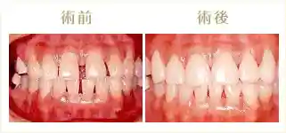 前歯の隙間と歯の黄色さが気になります。上の歯はラミネートベニアを用いて隙間をなくし白くなりました。下の歯は部分的な矯正で隙間をつめ、ホワイトニングにより白くしています。
